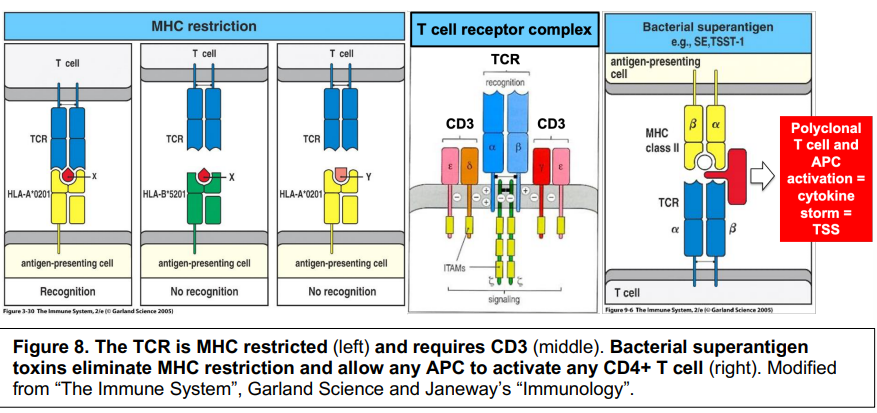 Superantigens stimulate APCs as well as 2-20% of all mature CD4+ T cells - results in massive, systemic pro-inflammatory cytokine release