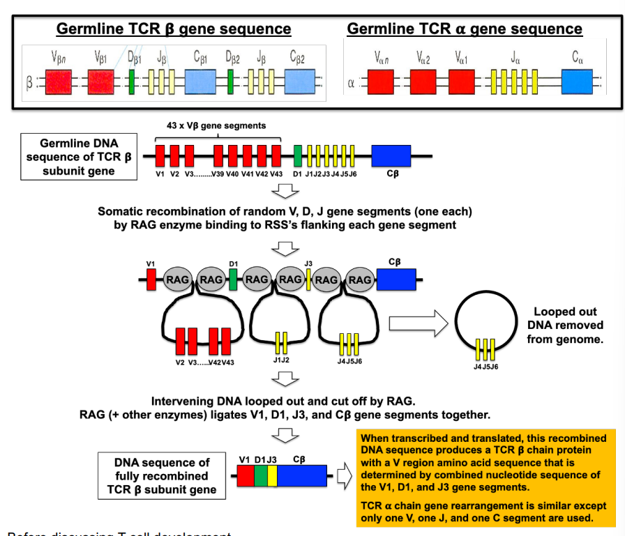 RAG enzyme binds to recombination signal sequences (RSS) flanking gene segments. It loops out and excises the DNA between gene segments. RAG and other DNA repair enzymes then ligate the segments to form a contiguous DNA sequence in the TCR α or β chain gene.