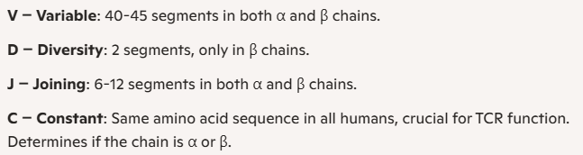 C - Constant: This part is the same across all humans and is essential for TCR function.