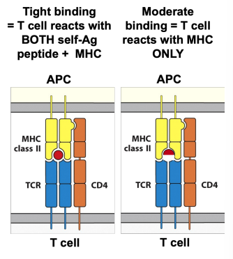 Double-positive thymocytes that have moderate-strong binding affinity to either MHC class I or MHC class II and self-antigen peptides presented on thymic cortical epithelial cells will survive