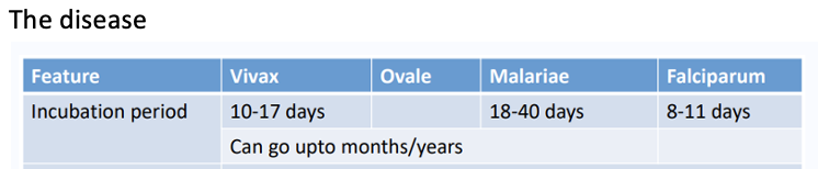Explain abit about the incubation period of the different malarial parasites
