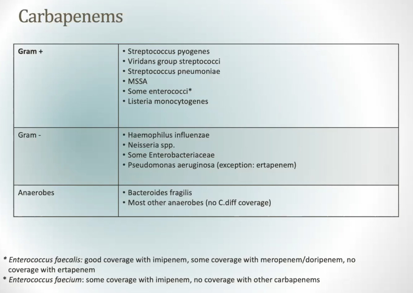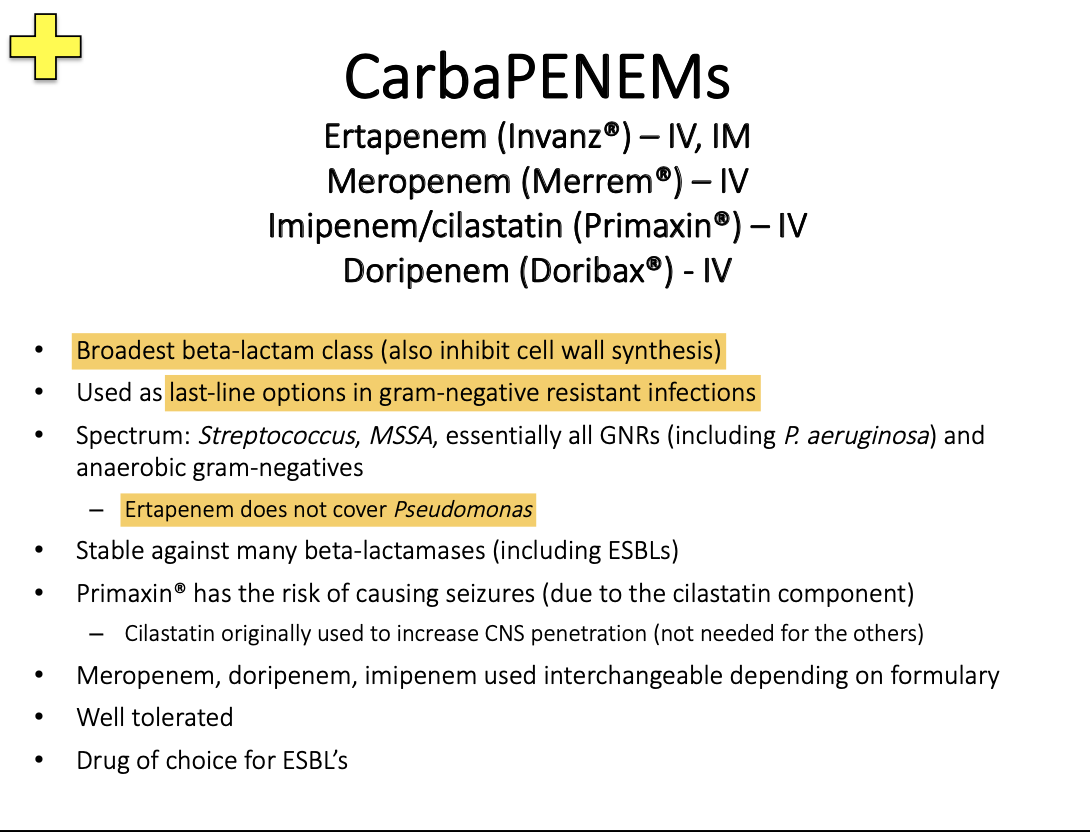 Meropenem (Merrem®) – IV Imipenem/cilastatin (Primaxin®) – IV Doripenem (Doribax®) - IV