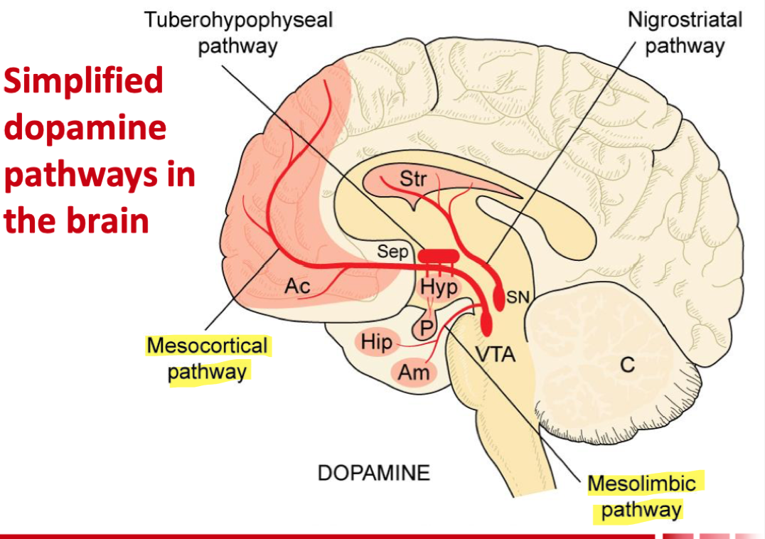 Dopamine follows the Mesocortical (frontal lobe to the midbrain) and Mesolimbic pathways (from midbrain to Amygdala and hippocampus)