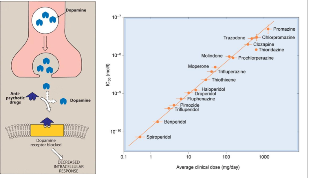 - Strong correlation between clinical potency of antipsychotics and D2 blocking action