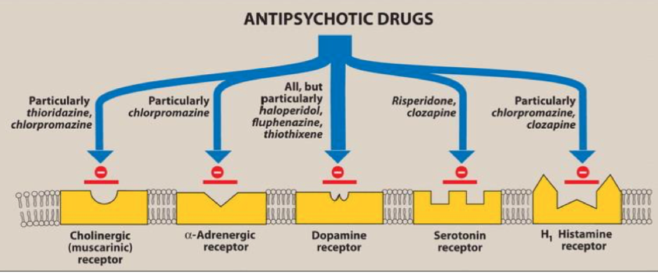 - Chlorpromazine (blocks Histamine H1, Cholinergic / muscarinic, alpha adrenergic receptors - pretty much all)