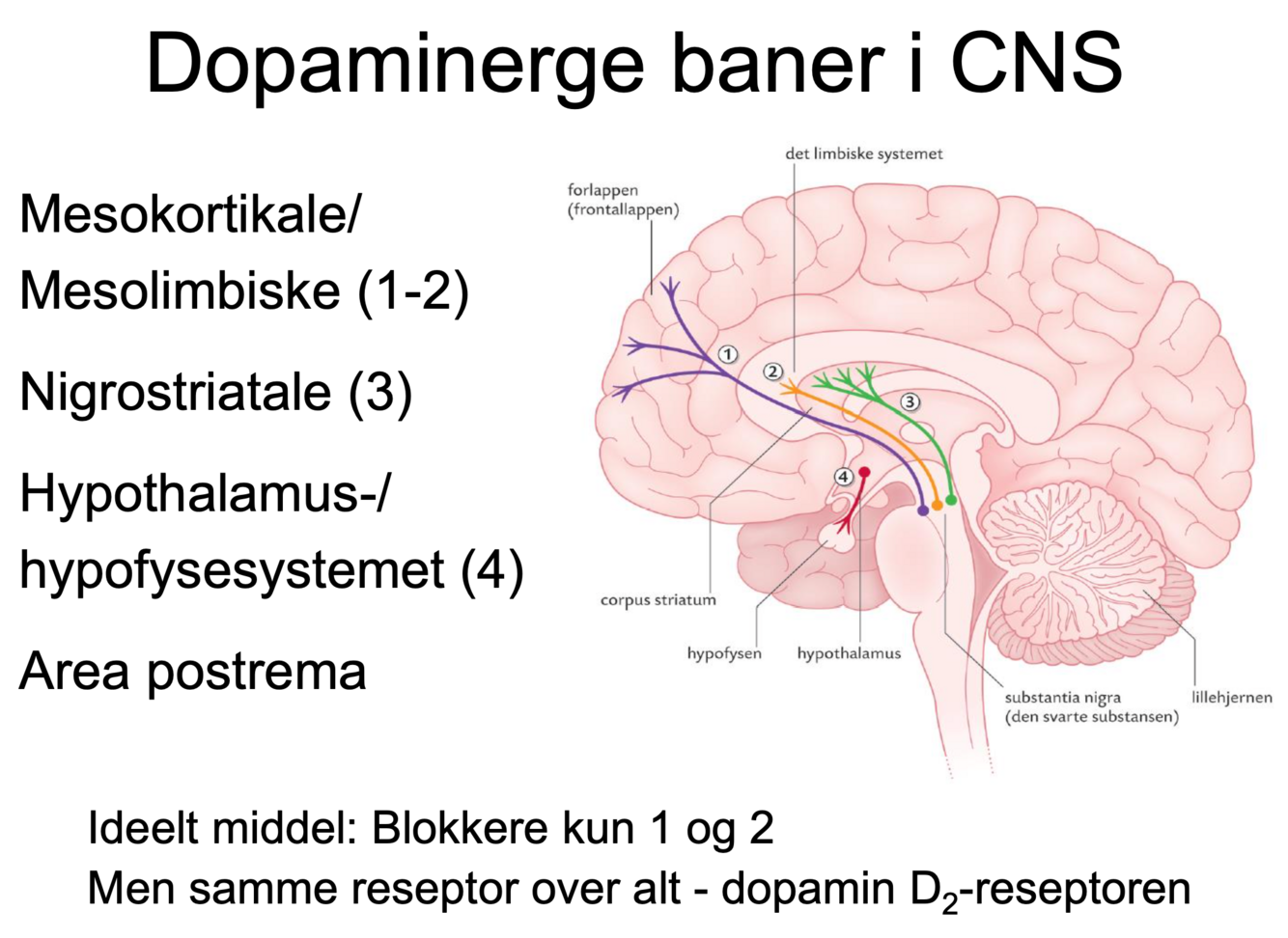 Hvilke dopaminerge baner virker antipsykotika på i CNS?