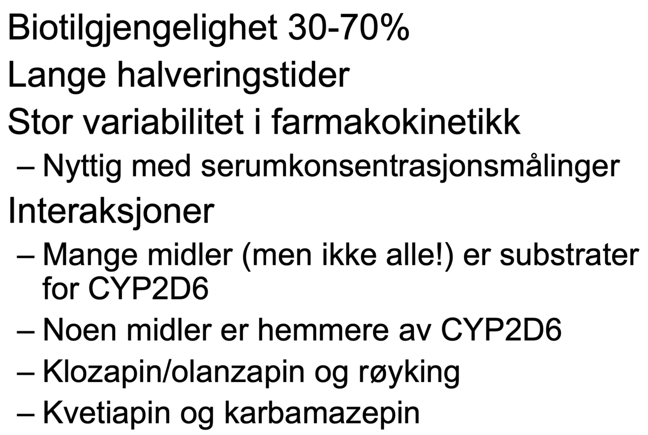 Hvilke farmakokinetiske egenskaper har antipsykotika, og hvilke interaksjoner kan de ha?