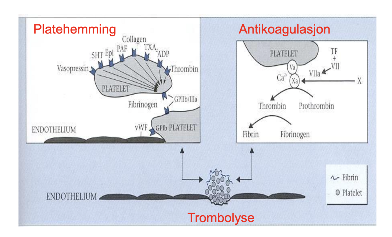 Platehemmere gir ofte utilstrekkelig trombolyseprofylakse → antikoagulantia skal brukes