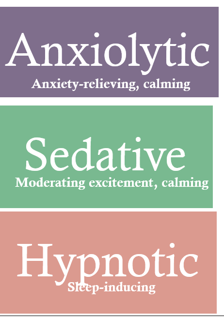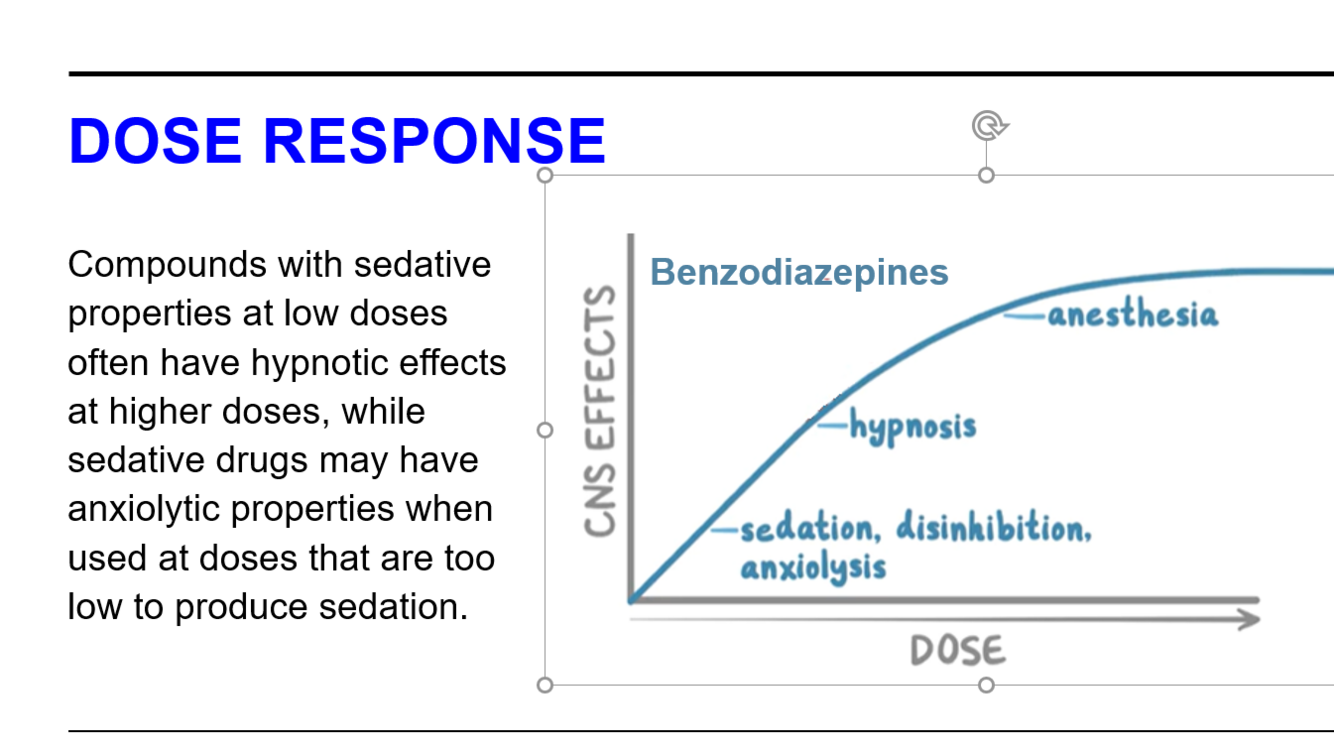 Dose–response: increasing CNS inhibition → calming → sedation → sleep induction.