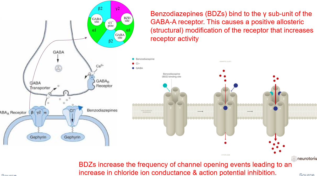 benzos Increase frequency of channel opening → ↑ Cl⁻ influx → ↓ action potential firing.