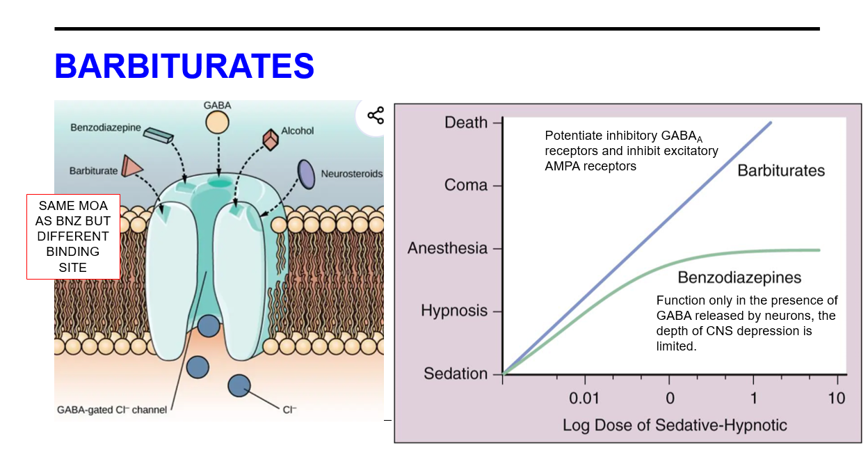 Q: Barbiturates MOA at inhibitory and excitatory receptors?