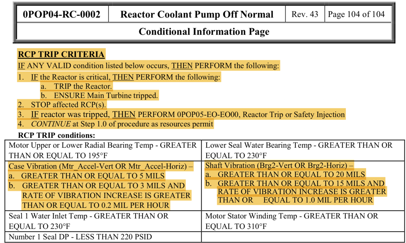 What RCP Case and Shaft Vibrations would require the operator to trip the RCP?