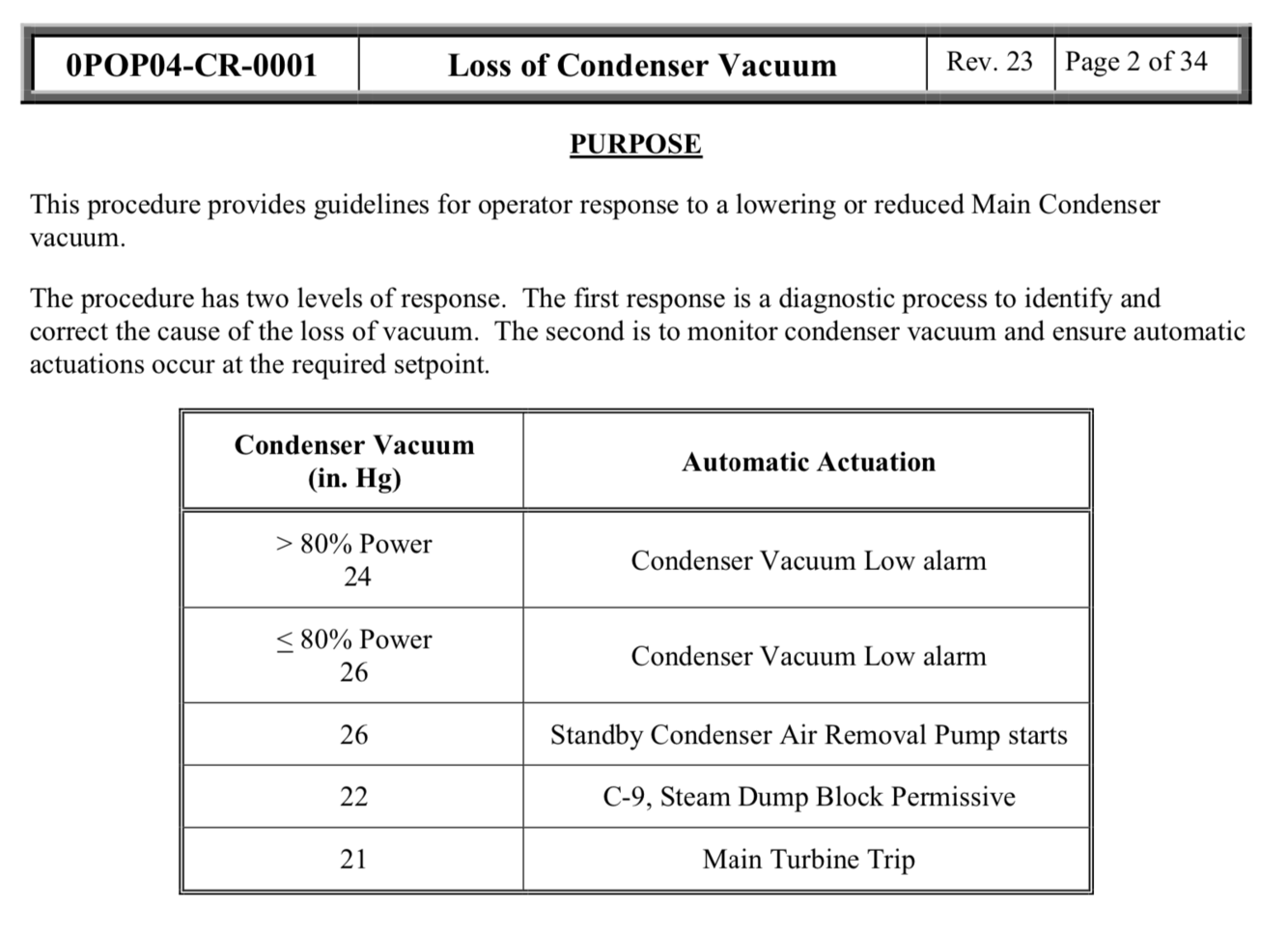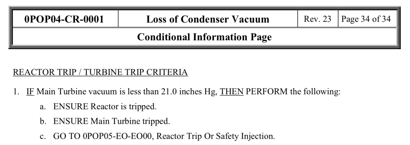 What are the important values of main condenser vacuum? (i.e. alarms, actuations, ect.)