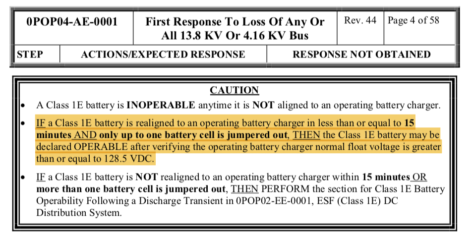 A Class 1E battery is INOPERABLE anytime it is NOT aligned to an operating battery charger.