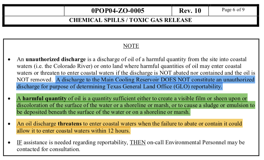 Discharge into Main Cooling Reservoir does NOT constitute an unauthorized discharge