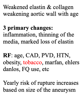 Describe the etiology and RF for aortic aneurysm