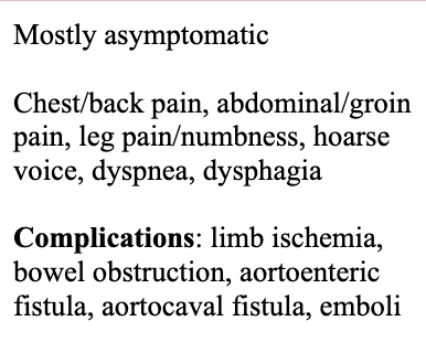 Describe the signs/symptoms of an aortic aneurysm as well as some complications