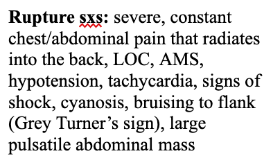 What are the signs/symptoms of an aortic aneurysm rupture