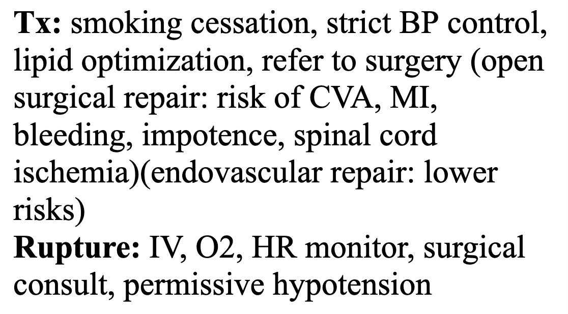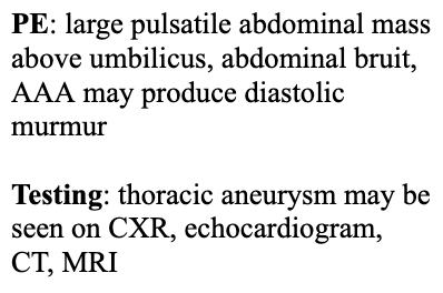 Describe the exam findings and testing for aortic aneurysms