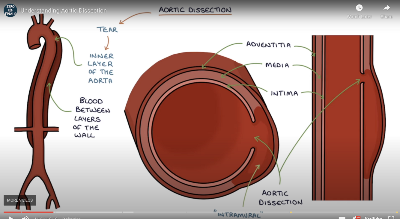 Which layer of the artery is damaged/ruptured in an aortic dissection?