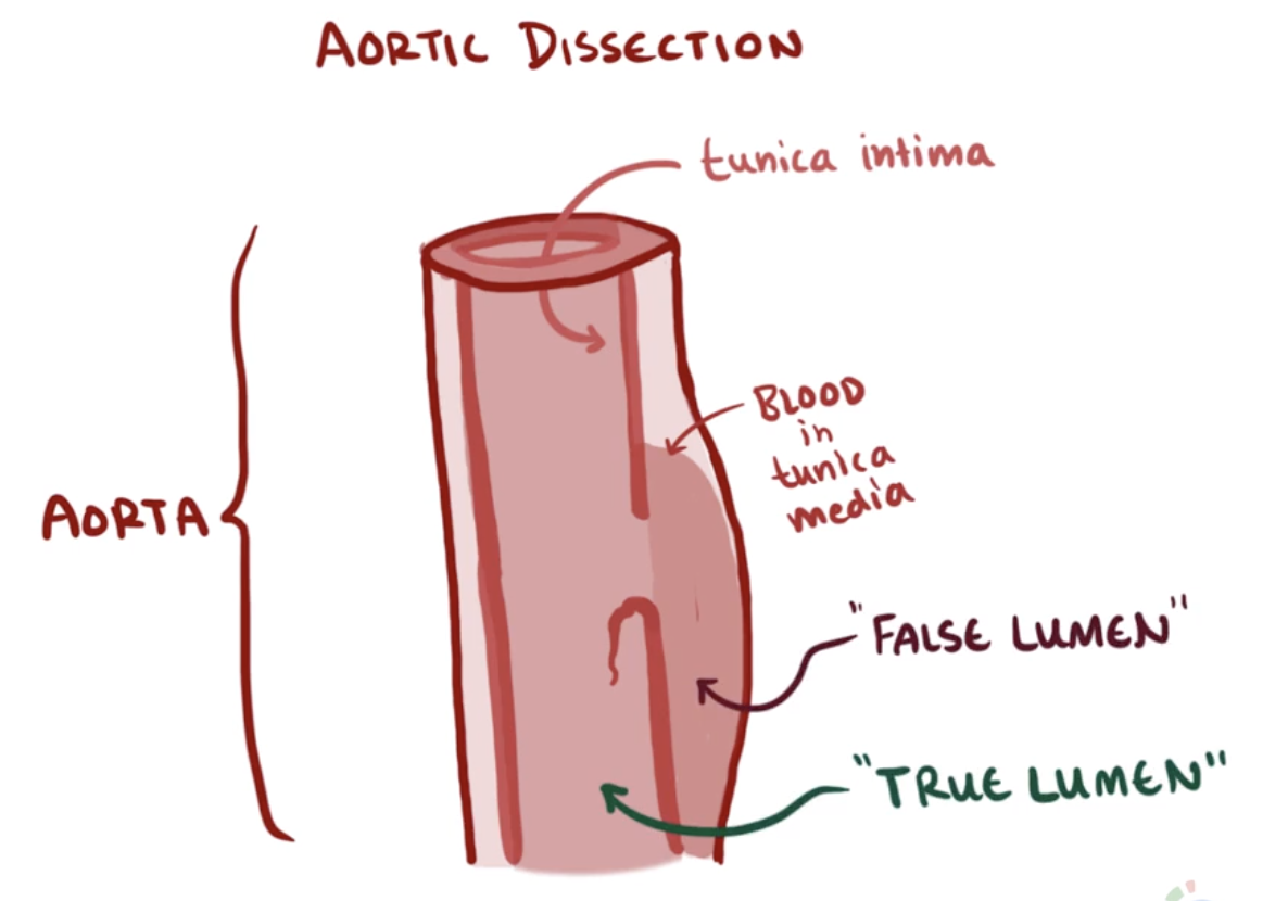 In an aortic dissection there is damage to the innermost layer of the arteries, the tunica intima. High pressure blood then begins leaking into the tunica media, causing further damage to the tunica intima. This then forms what?