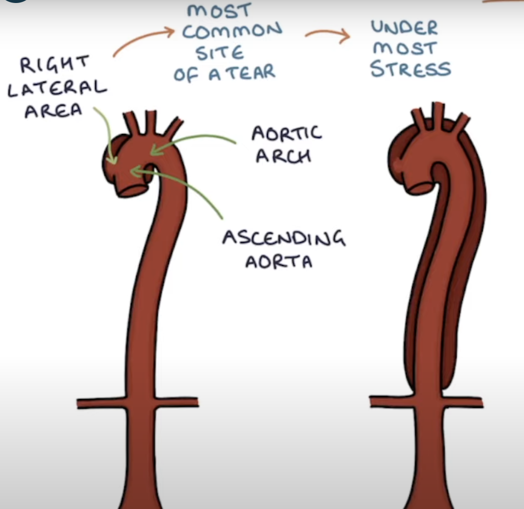 The aorta is the most often place aortic dissection occurs. Specifically which part of the aorta does this generally occur?