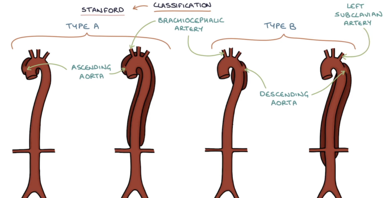 There are 2 classifications of aortic dissection, the Stanford and DeBakey system. What is the definition of a type A aortic dissection according to the Stanford classification?