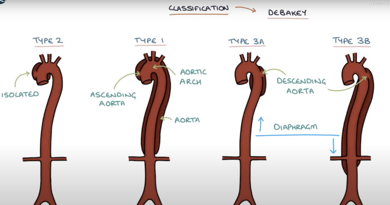 3 - begins in the ascending aorta and involves at least the aortic arch, if not the whole aorta