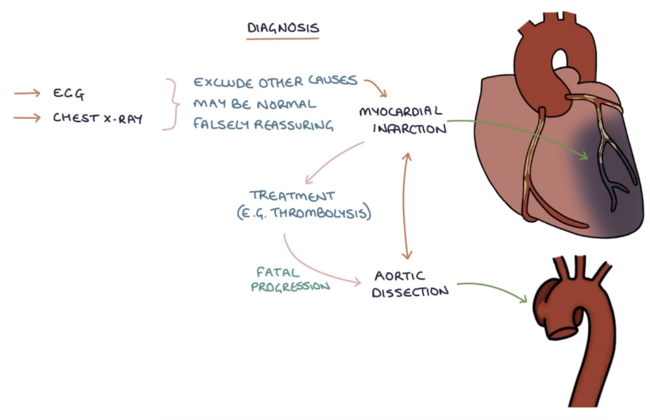 If a man presents with a sudden onset of tearing chest pain, is aged >60 y/o, has a history of hypertension and has risk factors for Marfan ehlers danlos or