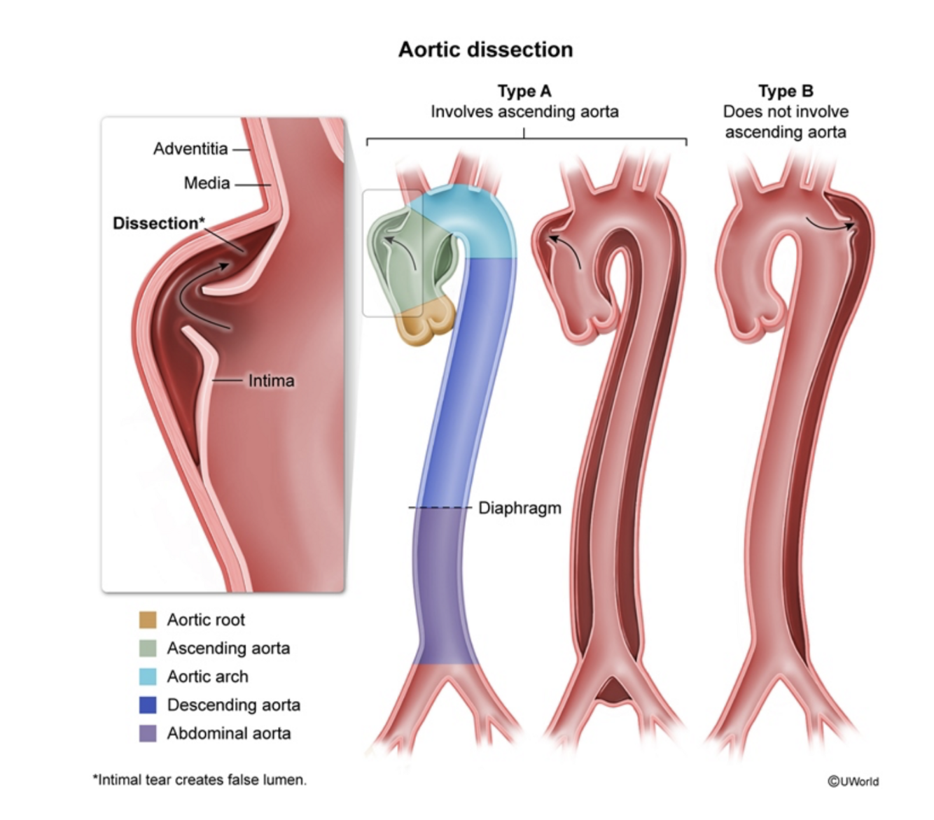Stanford Type A involves the ascending aorta or arch. Stanford Type B involves the descending aorta distal to the subclavian artery.