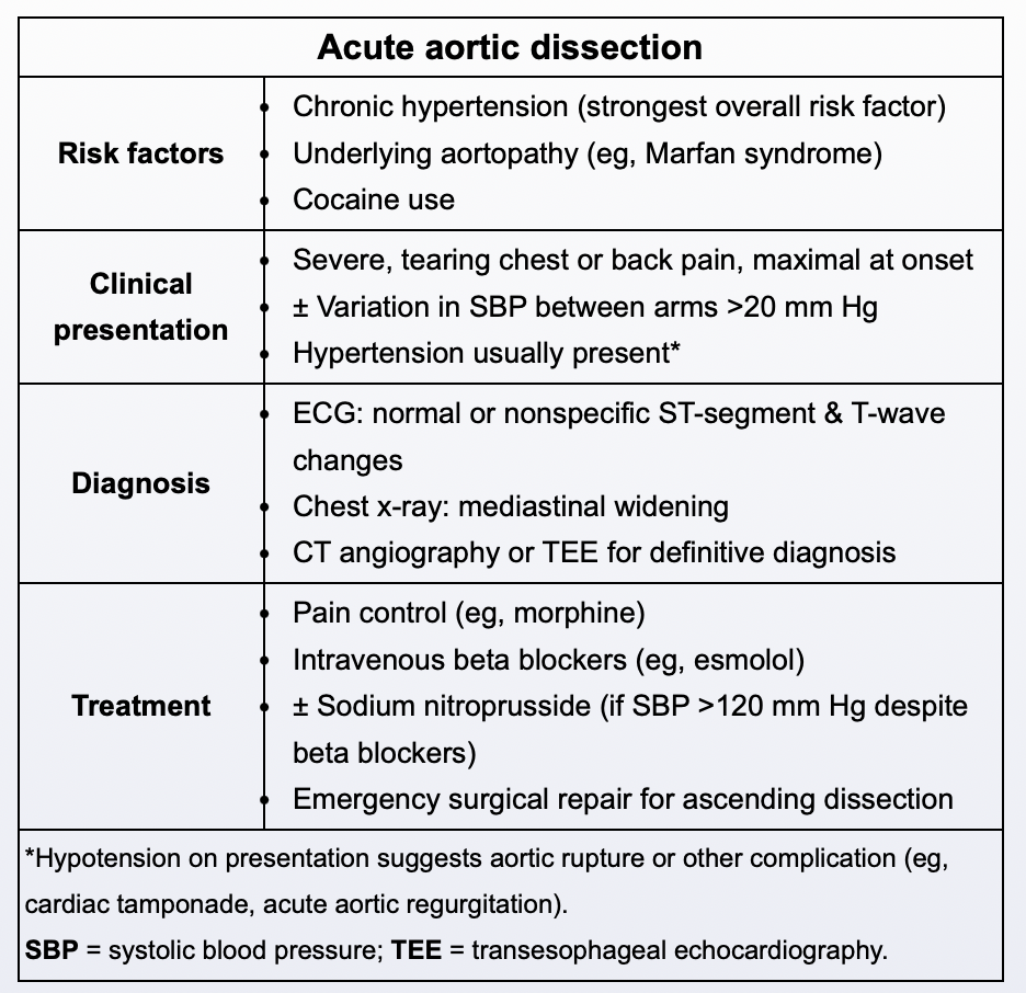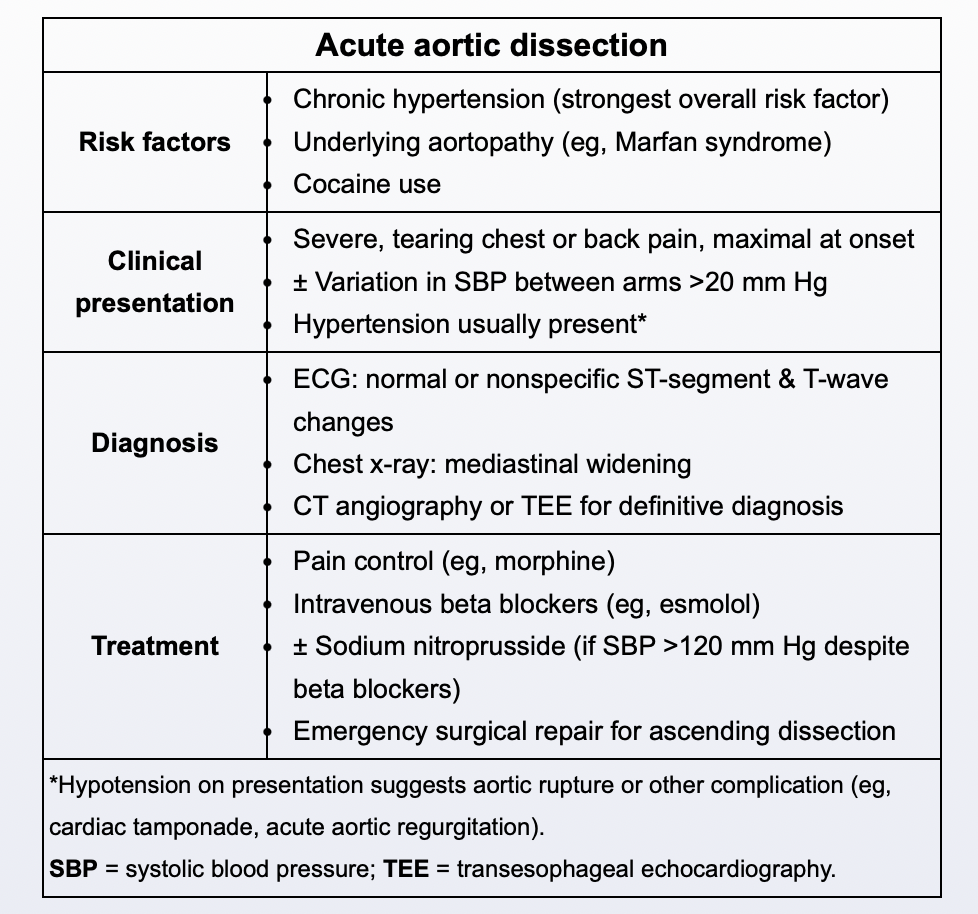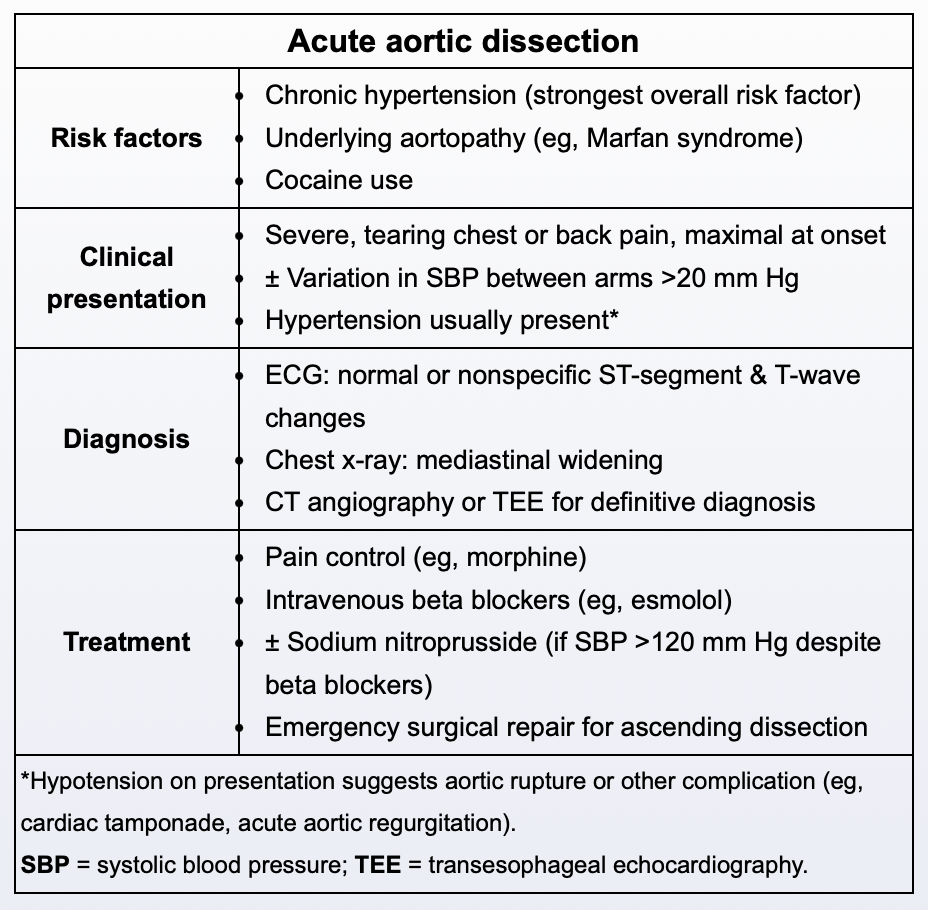 Severe chest pain radiating to the back with a ‘tearing’ quality and asymmetric blood pressure (>20 mmHg difference).
