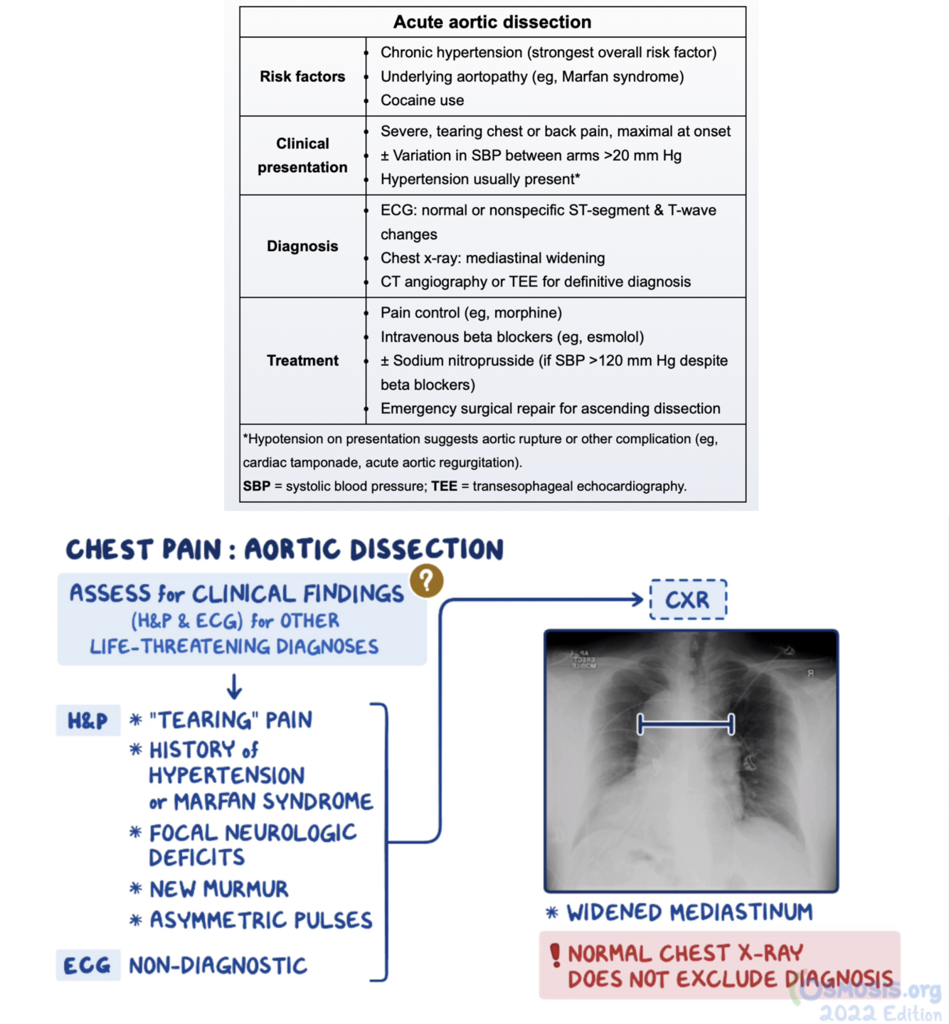 A widened mediastinum. A normal CXR does not rule out an aortic dissection.