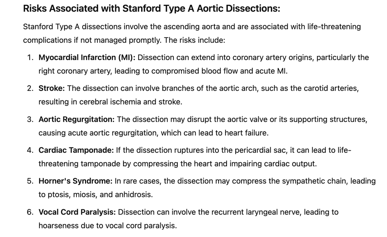 What are the risks associated with Stanford Type A dissections?