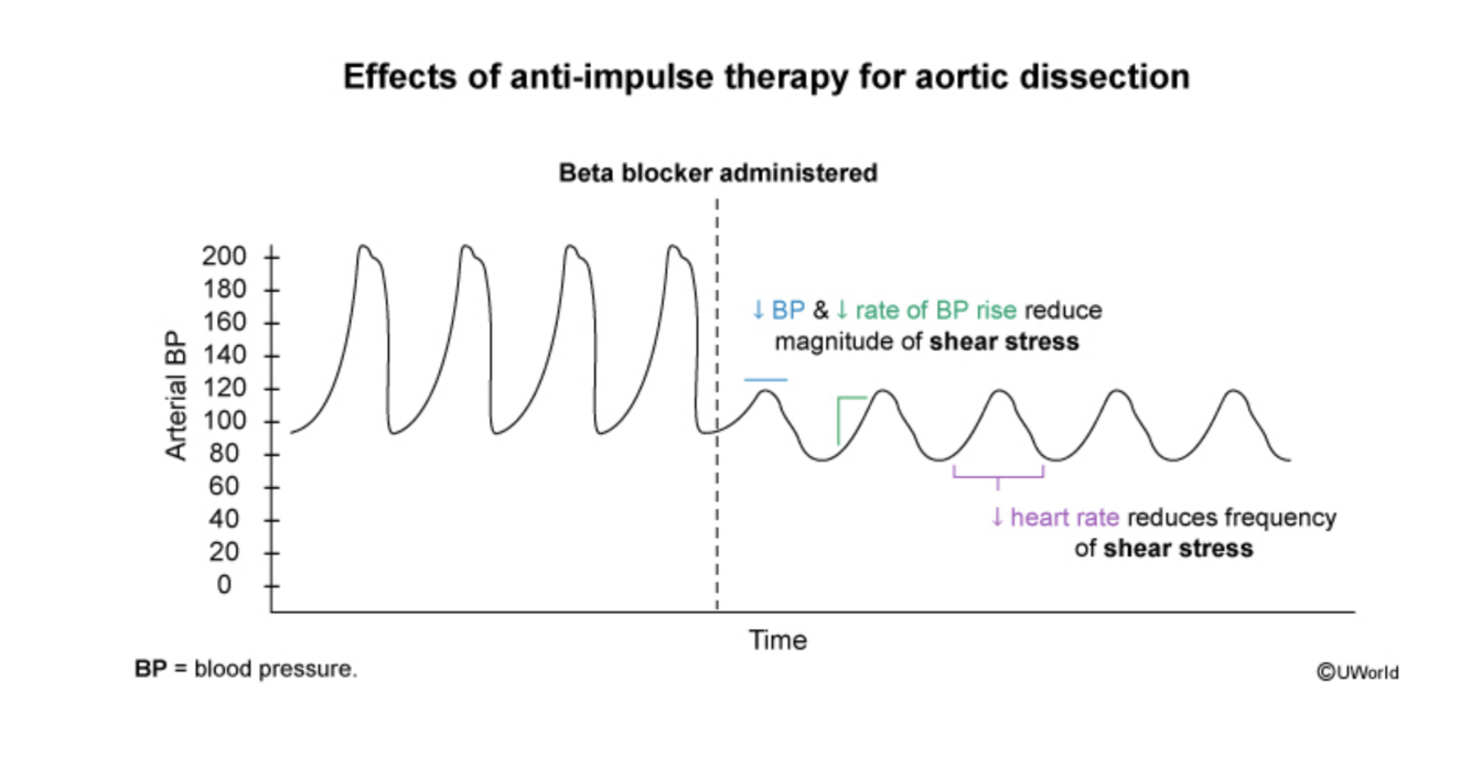 Maintain heart rate < 60 bpm and systolic blood pressure between 100-120 mmHg using IV beta blockers (e.g., Esmolol or Labetalol). Nitroprusside may be added if BP remains elevated. Provide IV opioids. Esmolol is often preferred in acute settings due to its short half-life (~9 minutes), which can allow for rapid titration and optimal heart rate and blood pressure control. Adequate pain control (eg, morphine) also assists in reducing aortic wall shear stress by further reducing sympathetic drive to decrease blood pressure and heart rate. In addition to medication therapy, emergency surgical repair is needed for ascending dissection.