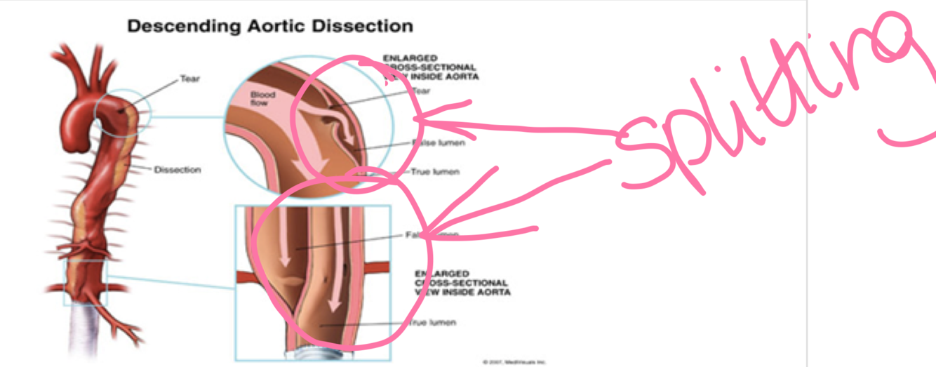 condition where the tear in the aortic intima allows the blood to surge into the aortic wall -> causing a split between the inner and outer tunica media-> creating a false lumen