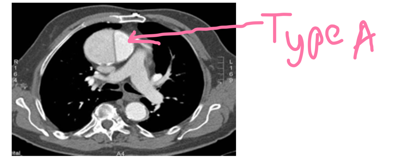 Type A : Ascending aorta ( most common ) 70% - retrosternal chest pain