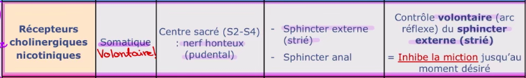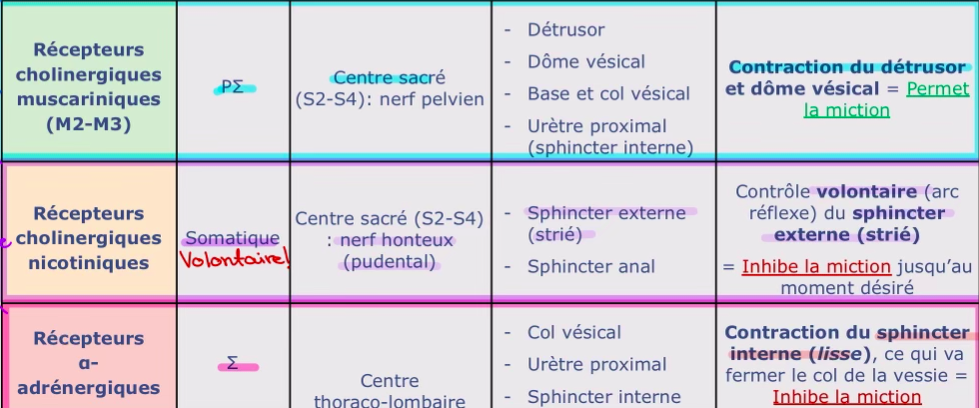 Les récepteurs cholinergiques, sous contrôle parasympathique, sont distribués de façon à peu près uniforme au dôme de la vessie, à sa base, au col et à l’urètre proximal