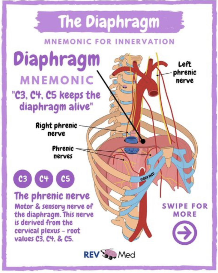 N. phrénique: C3, C4 C5 Keeps the diaphragm alive