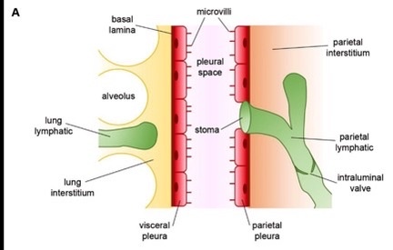 Du bord pariétal on retrouve des ouvertures (stomates) entre les cellules mésothéliales–>permet de drainer le liquide de l’espace pleural dans le système lymphatic