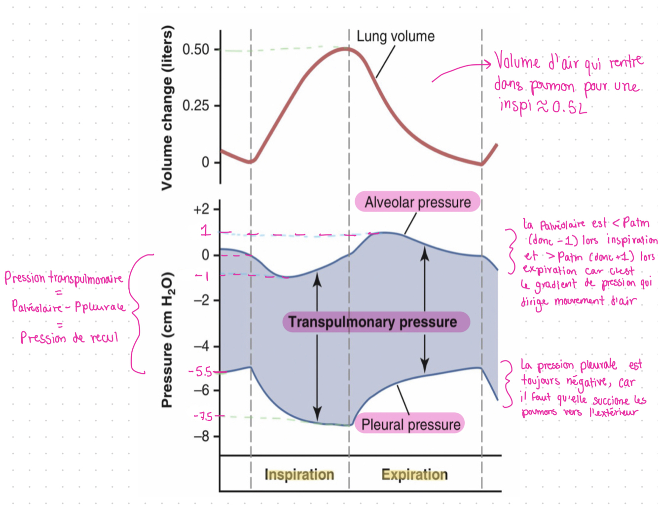 Pression transpulmonaire maximal= fin inspiration=7.5 cm d’H20
