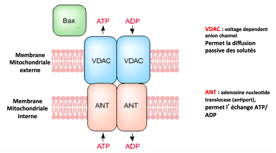 L’augmentation de la perméabilité membranaire mitochondriale (PMM) est due à l’activation du complexe VDAC-ANT (= PTPC)