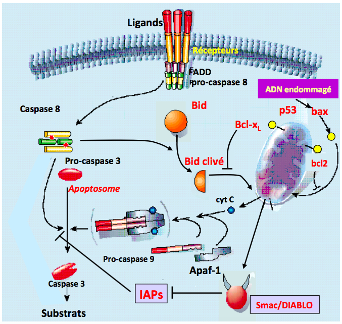 Les protéines Smac/Diablo libérées par la mitochondrie altérée ont la capacité de se lier aux protéines IAPs. Ceci entraîne l’inactivation des protéines IAPs et favorise donc l’apoptose