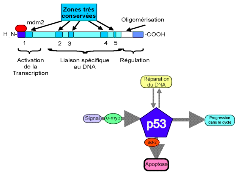 La protéine p53 possède de nombreux domaines fonctionnels dont un spécialisé dans la reconnaissance de l ADN