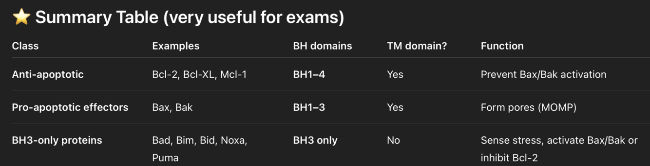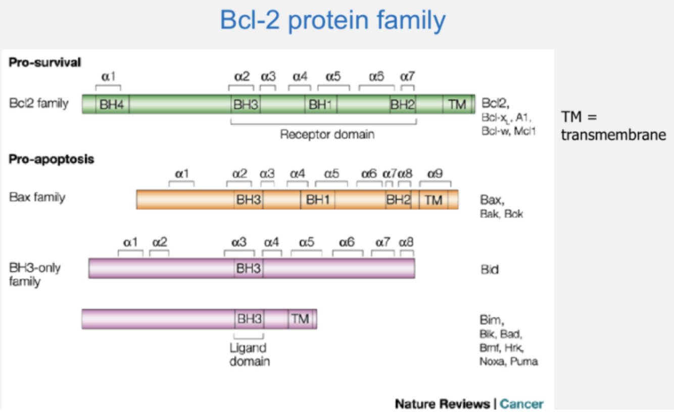 3 groups within Bcl-2 family proteins each with specific set of conserved Bcl-2 homology domains (BH)