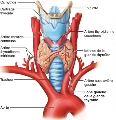 Artères thyroïdes sup et moyennes (provenant des carotides internes) et artères thyroïdes inf (provenant des sous-clavières).
