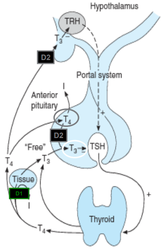 − T3 et T4 font aussi feedback sur neurones hypothalamiques sécrétant TRH. Dans ces neurones, T3 inhibe l’expression du gène de la pré-pro-TRH en se liant au récepteur TRβ