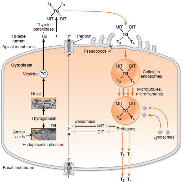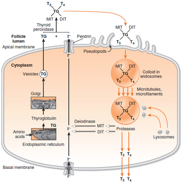 ● Endocytose de thyroglobuline iodée, mvmt apical → basal des vésicules endocytiques et fusion avec lysosomes.