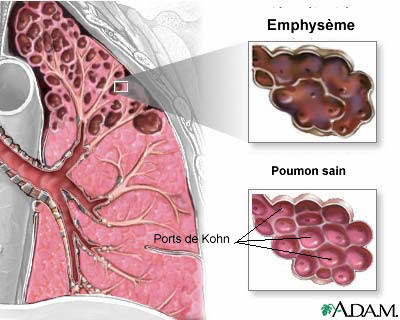 Tabac → Dilatation des cavités distales + destruction parois alvéolaires → CO2 reste piégé dans alvéoles → altération des échanges gazeux → hypercapnie, hypoxie, cyanose, thorax en tonneau