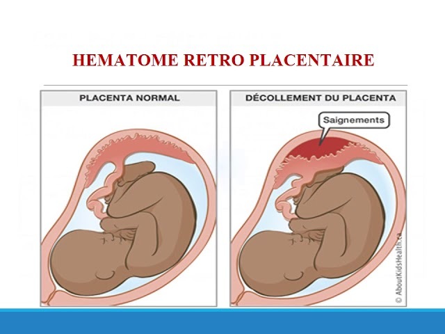 Décollement prématuré du placenta : détachement d’une partie ou totalité du placenta normalement inséré. Survient après la 20e semaine de grossesse et avant la naissance