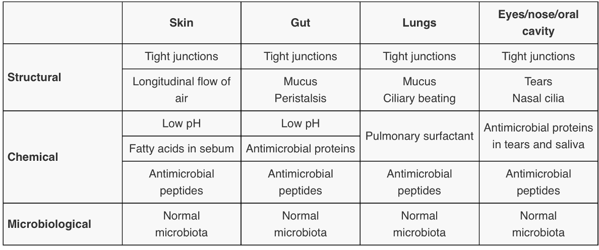 Peau et muqueuses, formant des barrières mécaniques, chimiques et microbiennes, constamment actives (avec/sans présence de pathogène)